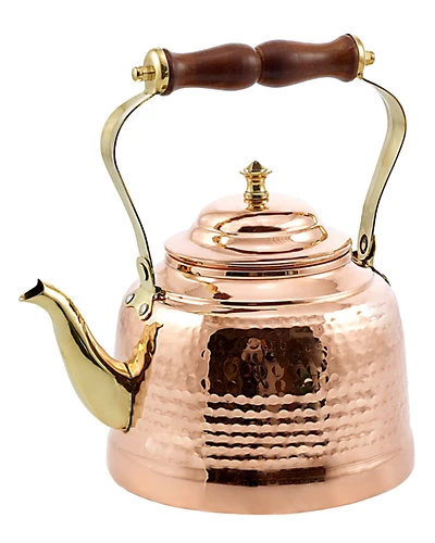 - Design details: The hand-hammered body combined with solid brass accents and a wood handle gives this kettle a look that will add a regal touch to both traditional and modern kitchens.