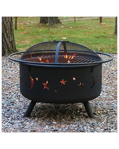 - A lovely fire pit to enjoy for years to come on the patio or in the backyard. The stars and moons design cast unique shadows at night and provide a healthy cross breeze to the wood burning fire. Ships as a complete set including a beautiful rustic fire pit, spark screen, lifting tool/fire poker, wood grate and a cooking grate to cook dinner! The perfect solution to an outdoor fire.