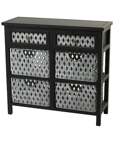 - Store your belongings without compromising style and function with this storage cabinet organizer that easily complements sheer drapes and neutral-toned walls for an instant upgrade to your home. Designed with black rubber stoppers at the base that prevent scratching as well as sliding around. This item ships in 1 carton. Furnished with 2 wooden drawers measuring 13″L x 10″W x 5″H and 4 metal basket drawers measuring 14″L x 11″W x 9″H. Suitable for indoor use only. Maximum weight limit is 100 lbs. Farmhouse style. Crafted to offer any farmhouse or country cottage themed home a final touch with a cozy rustic appeal. Standing storage unit is made of a solid fir wood, MDF and metal drawers. Matte black and brushed gray finish completes the farmhouse look of this storage cabinet with antique gold knobs. Black wood cabinet features weaved pattern drawers with convenient knobs and pull out inspired baskets with ample space for all your storage and organizational needs. Item measures 34″L x 13″W x 33″H and weighs 39 lbs