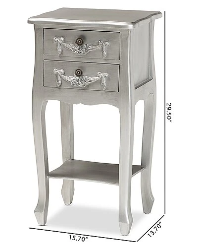 - Uplift your nightly routine with the timeless style of the Eliya nightstand. this exquisite piece is comprised of a solid wood frame embellished with metal drawer knobs. Two drawers provide space to organize bedside essentials, while the open shelf serves as a convenient display for larger items. The Eliya will arrive fully assembled and features cabriole legs for excellent stability and support in elegant style. Floral moldings add a graceful touch, making the Eliya nightstand an enchanting addition to any bedroom. Overall Dimensions: 29.50″ High x 15.70″ Wide x 13.70″ Deep; Drawer(Each): 10.60″ Wide x 9.80″ Deep x 3.50″ High; Open Shelf: 11.50″ Wide x 9.00″ Deep x 11.25″ High; Legs: 6.70″ High;