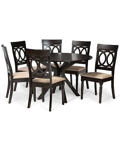 - Enhance your dining space with the elegant style of the Jessie dining set. this wooden set includes six dining chairs and one table. Each chair is upholstered in a light fabric that complements the rich dark brown finished wood. Designed with both comfort and style in mind, each chair features a plush foam-padded seat, as well as an exquisite cut-out design on its back. Requiring assembly, the round tabletop provides ample elbow room for each member of the table. Well suited for both casual meals and formal dining, the Jessie dining set is an excellent upgrade to the modern home. Table Dimensions: 29.9″ high x 47.2″ wide x 47.2″ deep; Legs: 29.1″ high; Chair Dimensions: 38.6″ high x 17.9″ wide x 22″ deep; Seating dimensions: 18.7″ wide x 15.7″ deep x 17.9″ high (from Floor); Back: 19.7″ high; Legs: 16.9″ high;