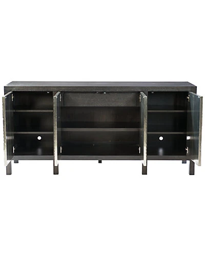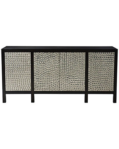 - Design details: Quartered sandblasted oak veneers in Black Truffle finish. Four touch latch, German Silver wrapped doors with decorative pattern. Adjustable glides. Anti-tip kit. LSF/RSF: One door. Behind door are two adjustable/removable shelves and one grommet hole with cover in back panel for wire management. CENTER: Two doors. Behind doors is one adjustable/removable shelf, one drawer and one grommet hole with cover in back panel for wire management.