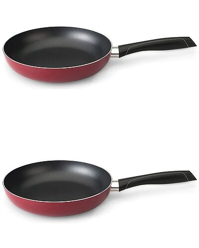 - BergHOFF’s Geminis 2pc Stir Fry Pan Set – These will be your go-to pans for all your frying and sauteeing needs. Lightweight aluminum fry pans are easy to handle while durable enough for everyday use. Low, flared sides allow food to be turned easily with silicone/nylon utensils. Bonded multilayer nonstick system offers easy release. the Ferno green non-toxic coating is PFOA free and allows for healthy, low fat cooking with easy cleanup. Compatable with gas range, electric coil, or glasstop stoves. To help protect the nonstick feature, we recommend using silicone, nylon, or wooden utensils only. Scarlet red exterior body, dark gray nonstick coating (interior), black handle. Set includes two 9.5″ fry pans. Handwash recommended with warm water and mild detergent; avoid cleaners that contain bleach or citrus extracts. Use a soft sponge or dishcloth to clean the surface. Avoid scouring pads and other abrasive materials. If you stack your cookware to store, be sure to place a proper sized dish towel or silicone protector pad between each pot to avoid the scratching of the surfaces of your pots/pans.