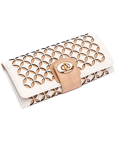 - Design details: Cream laser cut leather in intricate design, Chloe reflects the romantic and thoughtful you. Perfect for the devout jetsetter, organize and store your jewelry safely with Chloe jewelry roll. Includes cream leather, mirror, gold finished hardware, and patented LusterLoc lining to absorb the hostile gases known to cause tarnishing for up to 35 years. ; Storage: 2 ring holders, 8 earring holes and 4 storage compartments