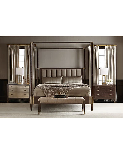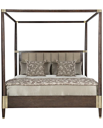 - Design details: Arabica finish on wood-framed headboard with Burnished Brass metal accents at top and bottom of posts and at headboard. Inset vertical channel upholstered panel. Metal ferrules. Arabica finish on wood footboard with Burnished Brass metal accents at top and bottom of posts.