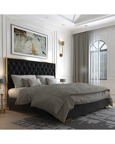 - Bring a high-end look to your bedroom with this velvet and stainless steel upholstered bed. Everything from the button tufting on the plush upholstery to the polished metal legs screams style! Perfect for a master bedroom that you will fall in love with.