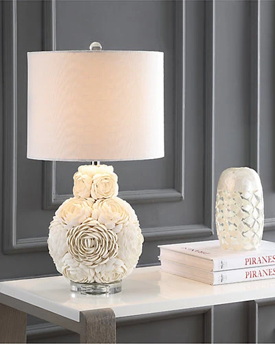 - Design details: resin, seashell, and crystal base; white linen shade; bulbs included