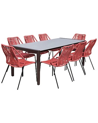 - The Fineline and Clip Indoor Outdoor 9 Piece Dining Set in Dark Eucalyptus Wood with Super Stone and Brick Red Rope is a durable and fashionable addition to any indoor or outdoor space. Just the piece for festive alfresco feasts and summertime soirees, this table features a unique tabletop made of a 5-layer composite with 2 layers of cement fiberboard surrounding the aluminum honeycomb core. This beautiful tabletop is durable and robust – capable of withstanding inclement weather and everyday wear and tear. The 80” width of the Fineline dining table is perfect for entertaining a large group of family and friends – making your outdoor area the place to be. Eucalyptus is a good choice for garden furniture as it has antifungal and antimicrobial properties. This means it has an inherent property to resist decay, rot and garden pests and can face the harshest of adverse climate-whether harsh sun, icy cold winds, cruel snow, or torrential rain. It is also rich in oil that naturally repels moisture and water. Each of the clip chairs are made with the best craftsmanship, with these chairs standing on top of durable metal legs in a Brick Red finish for a modern look. For use indoors and out, the soft UV coated nylon cords are hand dyed resulting in subtle tonal variations. This Fineline and Clip Indoor Outdoor 9 Piece Dining Set in Dark Eucalyptus Wood with Super Stone and Brick Red Rope comes complete with one Fineline Indoor Outdoor 80″ Rectangle Dining Table in Dark Eucalyptus Wood and Super Stone and 8 Clip Indoor Outdoor Stackable Steel Dining Chairs with Brick Red Rope. Table Dimensions: 81″W x 35″D x 30″H. Chair Dimensions: 22″W x 25″D x 35″H SH: 18.6″.