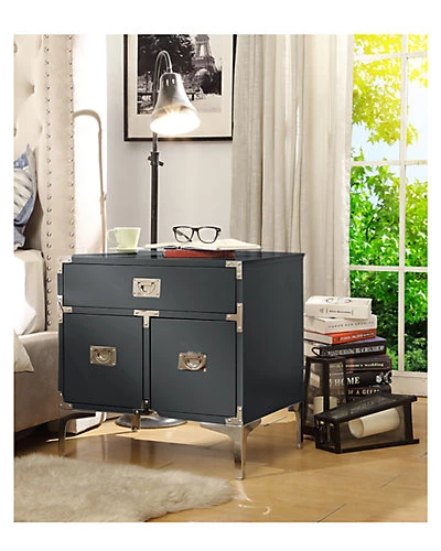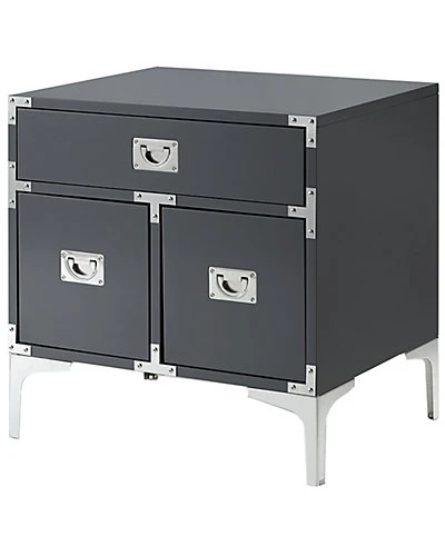- Design details: MDF construction; lacquer finish; chrome legs; one drawer; two door compartments; decorative corner brackets; silver pull; doors feature a soft close mechanism