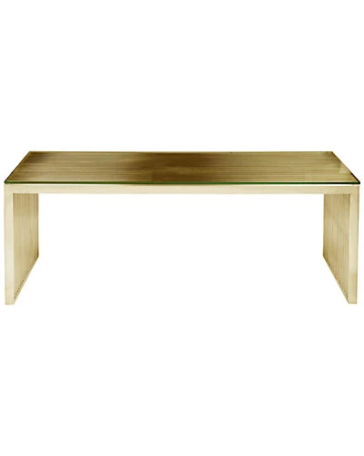 - Design details: Cool modern brushed gold steel coffee table with tempered glass top; edgy and modern; brushed steel/glass