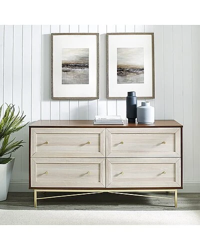 - Complete your contemporary bedroom with this modern four-drawer dresser. Four spacious drawers provide plenty of extra storage for clothes, linens, or accessories. The gold metal hardware and geometric legs add tasteful hints of glam influence to this stylish chest of drawers. Capped feet reduce scratches on the floor, and each drawer is fitted with smooth, telescoping metal glides. Both make for a piece that is not only nice to look at, but also nice to use.