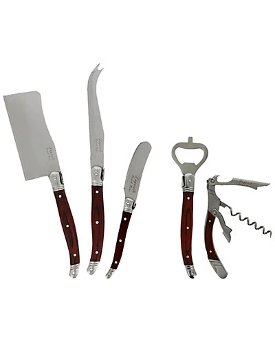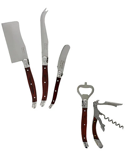 - Design details: The ultimate 5 piece Laguiole cheese and wine set! French Home’s three stainless steel cheese knives combined with a matching bottle opener and cork screw are essential to any bar, cocktail or dinnerparty. The traditional and elegant Laguiole design with the iconic three rivet curved handle and bee emblem is comfortable to hold and perfectly balanced. The pakkawood handles add warmth and refinement to your casual or formal get together. The set includes an 8.5″ Cleaver, 9.25″ Spear and 6.25″ Spreader, perfect for serving a variety of cheeses. Laguiole is a town in France where this style of cutlery originated.