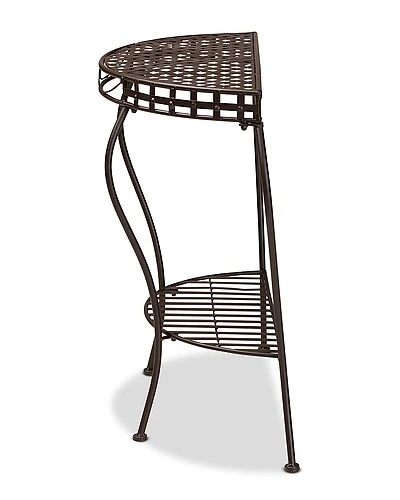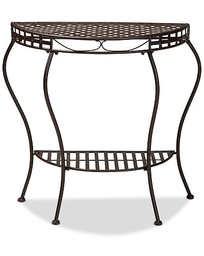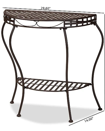 - Add the finishing touch to your outdoor oasis with the Laraine outdoor console table. Made in China, this table is constructed from metal featuring a sleek black finish. Its moon-shaped tabletop and shelf serve as an eye-catching pedestal for you to decorate with plants, lawn ornaments, and more. The Laraine will arrive fully assembled and is supported by slim cabriole legs for excellent stability. A simple yet impactful addition, the Laraine outdoor console table adds an elegant touch to any patio or deck area. Overall Dimensions: 31.75in High x 29.60in Wide x 14.00in Deep; Bottom Shelf Dimensions: 24.4in Wide x 11.60in Deep x 22.25in High; Legs: 9.00in High;