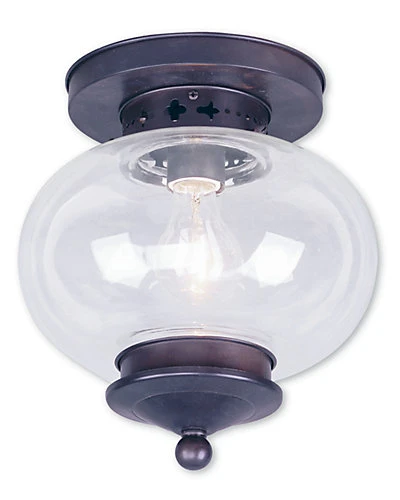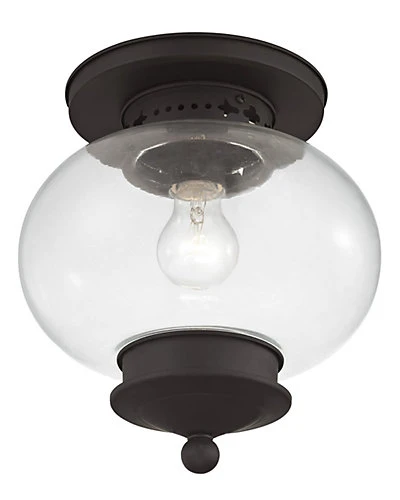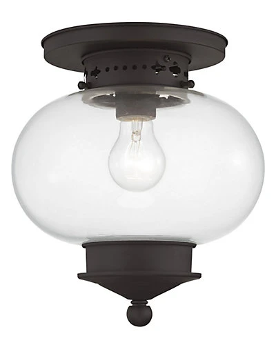 - This elegant solid brass flush mount from the Harbor collection will add a warm glow to any living space. It features a bronze finish embellished with decorative etched metal details and hand blown clear glass.