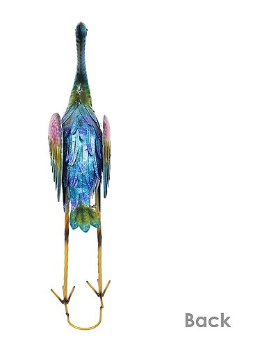 - This outdoor metal crane statue will be an instant focal point in the yard, garden, or any outdoor living space. Easy to assemble, the crane statue comes in 2 pieces that are connected via a thumbscrew and easily come apart for storage. Featuring a vibrant iridescent color scheme, the crane yard art sculpture is sure to add just the right finishing touch. The statue is designed to last with iron sheeting construction and a powder-coated finish. Next, the painted top coat ensures a long-lasting, beautiful statue to accent the yard for many seasons to come.