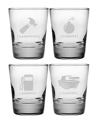 - Set of four double old-fashioned glasses with sand-etched “Mister Tipsy” designs (hammered, bombed, gassed and tanked)