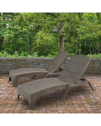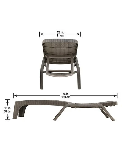 - Soak up the sun or just lay back and relax in these contemporary designed chaise lounges with a wicker textured finish. Offering four back positions including a lay flat option, each is constructed of high strength injection molded polypropylene material that is durable, weather-resistant and long lasting. Strong yet lightweight, these stackable loungers are easy to pick up to move, rearrange and store. UV treated to resist fading. No assembly required..Set of two chaise lounges.Dimensions: 76″L x 28″W x 15″H.High strength polypropylene construction.Durable and long-lasting, UV resistant.Contemporary slat style design, coffee color