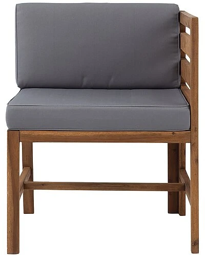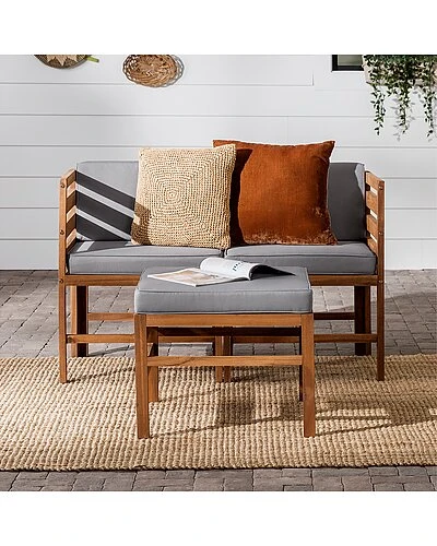 - Create a cozy chat set or a chaise-like bench with this three-piece modular patio set that includes two corner chairs and one ottoman. The cushions are three-inches, have removable UV resistant cushion covers, and hook and loop fasteners to keep them securely in place. The naturally weather-resistant solid acacia wood frame should be treated with teak oil every 2-3 months to maintain its vibrant color and durability.
