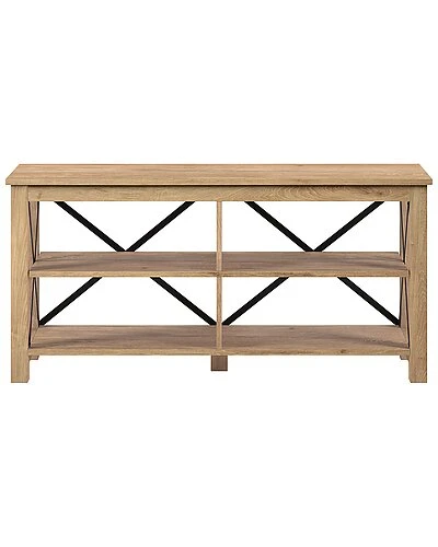 - Strong geometric lines set this modern farmhouse-inspired TV stand apart. Its X-shaped black metal accents offset the rich wood tone, creating a warm neutral color palette that will blend seamlessly into any design scheme. A must-have for living areas and entertainment spaces, this TV stand sets the stage for the big game, a movie marathon, or that season finale everyones been talking about.