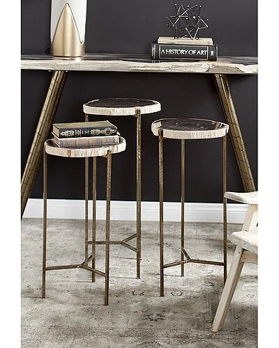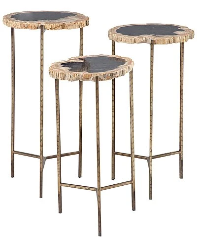 - Bring a finishing touch to your home with an inviting appeal with this beautifully crafted accent table. A compact friendly table providing you with additional surface storage space any where in your home. Make statement in your space with these wood and metal end tables displayed next to your upholstered leather sofa and dark colored pillows. Designed with black rubber stoppers at the base that prevent scratching furniture and surface floors, as well as sliding around. This item ships in 1 carton. Suitable for indoor use only. Max weight limit of 100 lbs. Accent furniture comes as a set of 3. Contemporary style. A contemporary style offers neutral elements and basic forms with a bold design. Round sofa tables is made of petrified wood stone and stainless steel. Contemporary wood side tables has a variation of beige, natural brown, black surface and gold legs. Set of 3 accent tables features natural petrified wood table top on tripod base with Y-shaped support beam in a slender design. Set of 3 petrified wood tables measure 12″L x 11″W x 26″H, 12″L x 11″W x 24″H, 11″L x 10″W x 22″H and weigh 27 lbs total