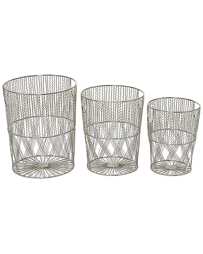 - This 3-in-1 metal basket set showcases a traditional woven look that goes well with contemporary concepts. It takes all the key featuresholes, weaves, and handlesbut using iron in their built. Use them as towel, blanket, Decor, fruit, and clothing holders. They can also function as laundry baskets, game consoles organizers, crafts racks, and umbrella, scarf, hat, and mitten holders at an entrance. This item comes shipped in one carton. Metal baskets have holes and handles. Suitable for indoor use only. Made in India. This is a three-piece metal basket set. Contemporary design.