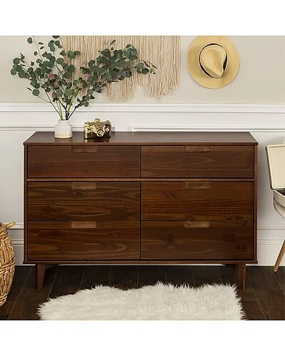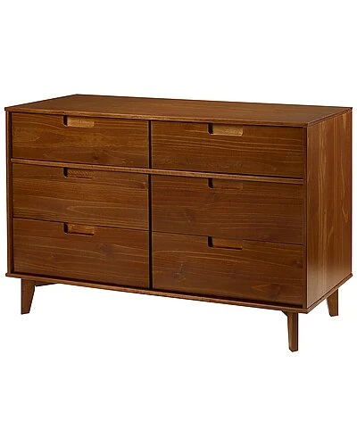 - Add storage space into your home for your clothing and extra throws or pillows with this 6 drawer dresser. In a stylish, Mid-century modern design featuring angled legs and cutout handles of solid pine wood in a stained finish. The intriguing design integrates a transitional aesthetic to complement your home decor. With six storage deep drawers to keep your clothing organized in your bedroom or for blankets and extra bedding in your guest room.