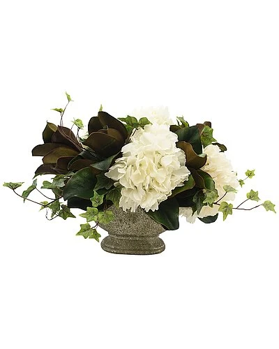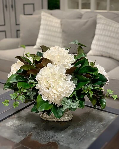 - Design details: white hydrangea, magnolia leaves and ivy in grey container.